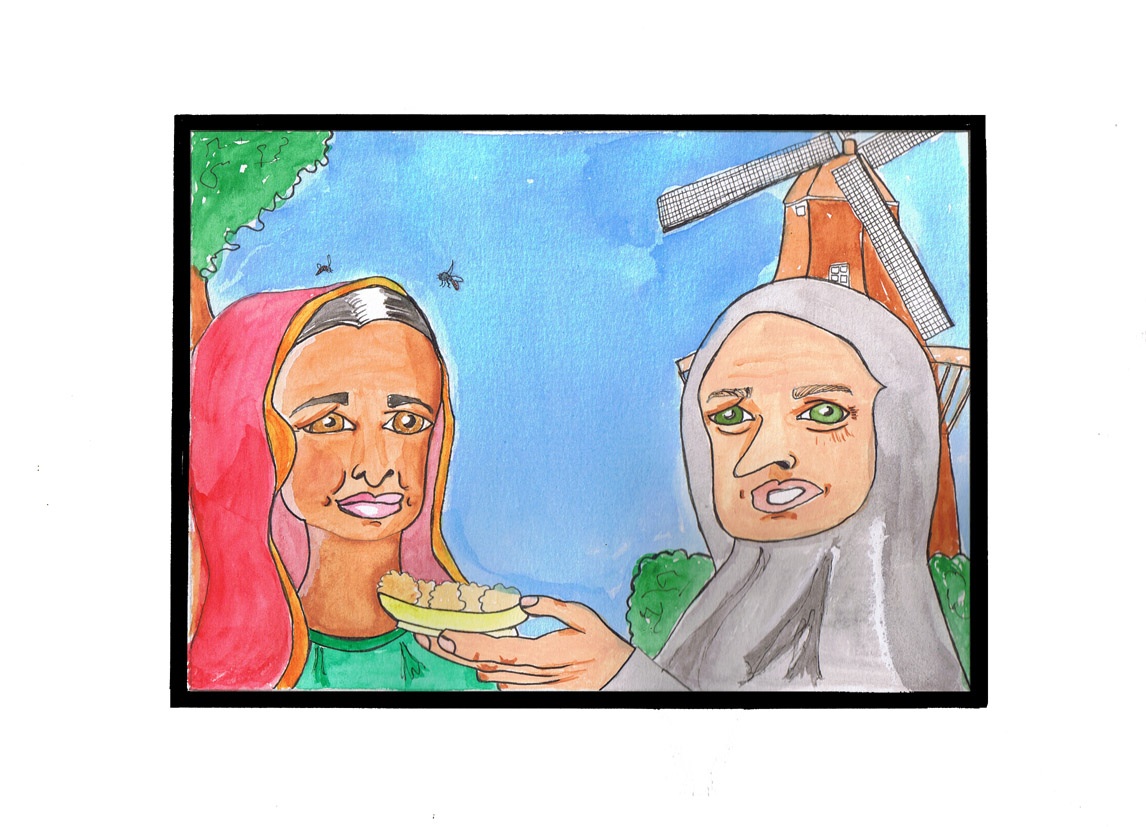 Quite suddenly we were joined by a group of ladies, all in headscarves. Two hugged and kissed each other several times. Way more than the three kisses almost hastily given in the air but meant for the cheeks, that I had grown accustomed to seeing around me. There before me, the two clasped and held and exchanged intense intimacies vocally in a singsong way, and kissed and kissed and kissed. They spoke in a tongue I couldn’t recognize. They wished my recent acquaintance, as the whole group settled onto the two benches that were on either side of the table. The language changed into a blend. Every now and then I caught a word, a phrase, an expression in the Dutch I knew and then it flowed into other sounds I didn’t. And every now and then there was a peal of laughter at my attempts to help the wandering wasp out of my gharaara. ‘They like your flowers’, one of them said in the Dutch I recognized. ‘They think they are real’.